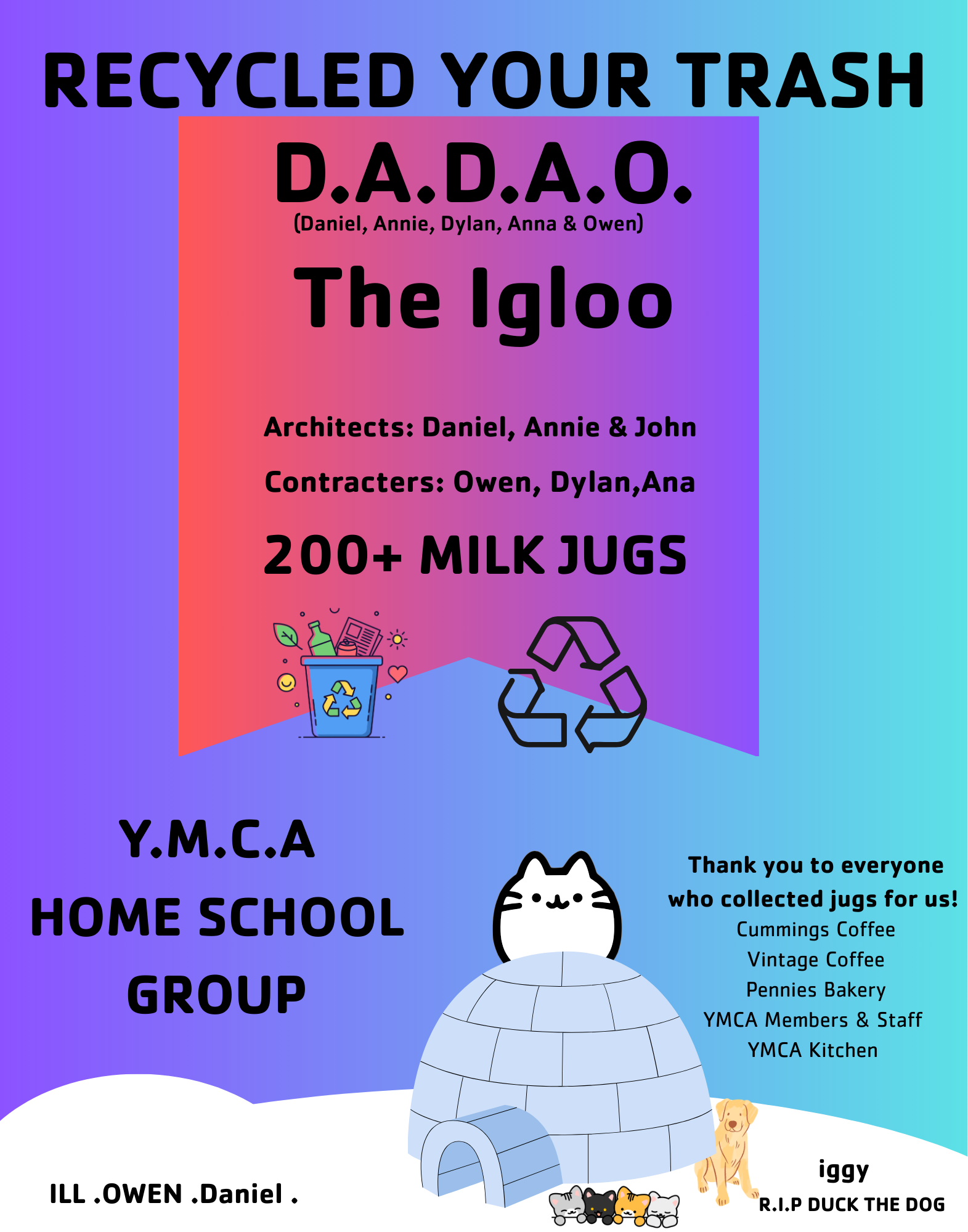 Our Homeschool participants spent this session learning about architecture and recycling by building a milk jug igloo! Thank you to everyone who collected jugs for them! Cummings Coffee, Vintage Coffee, Pennies Bakery, YMCA Members, YMCA Staff, YMCA Kitchen |