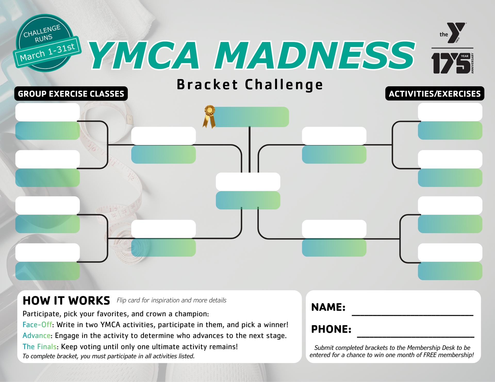 How to get involved in our March Madness Fitness Bracket: Pick up a card at the Membership Desk, complete it and return it to the membership desk to be entered for a chance to win a one-month membership! |