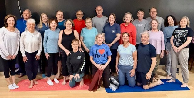 YOGA FOR EVERYONE! No matter your level of fitness, flexibility, or experience, we've got a yoga class for you: from Chair Yoga to Yoga Basics, Restorative Yoga, and the ultimate Power Yoga. "We're such a supportive group and we really enjoy our time together in the studio," says instructor Jill Garrett, pictured above (at center wearing her "I ❤️ The J" shirt) with her Friday morning Yoga Basics class. Learn more about these and our myriad other group fitness offerings that are available to all LJCC members.